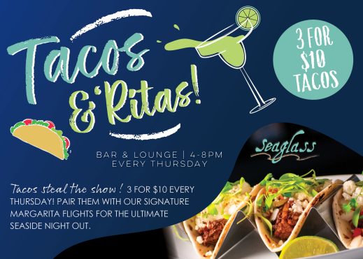 Tacos steal the show — 3 for $10 every Thursday! Pair them with our signature margarita flights for the ultimate seaside night out.