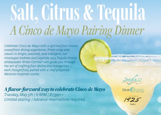 Celebrate Cinco de Mayo with a spirited four-course oceanfront dining experience. From crisp and classic to bright, seasonal, and indulgent, our mixologist Andrew and Leyenda 1925 Tequila brand ambassador Brian Cormier will guide you through the art of crafting four distinctive margaritas — each thoughtfully paired with a chef-prepared Mexican-inspired course.